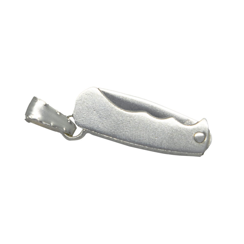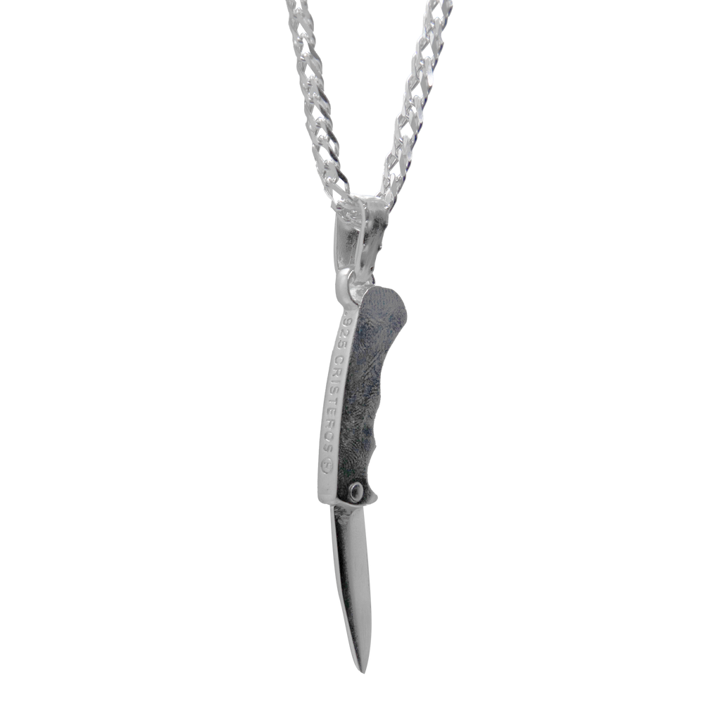 Dije de plata 925 con forma de navaja, capaz de abrirse y cerrarse al gusto. Este dije rescata lo más valiente y audaz de las personas.