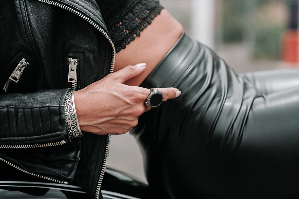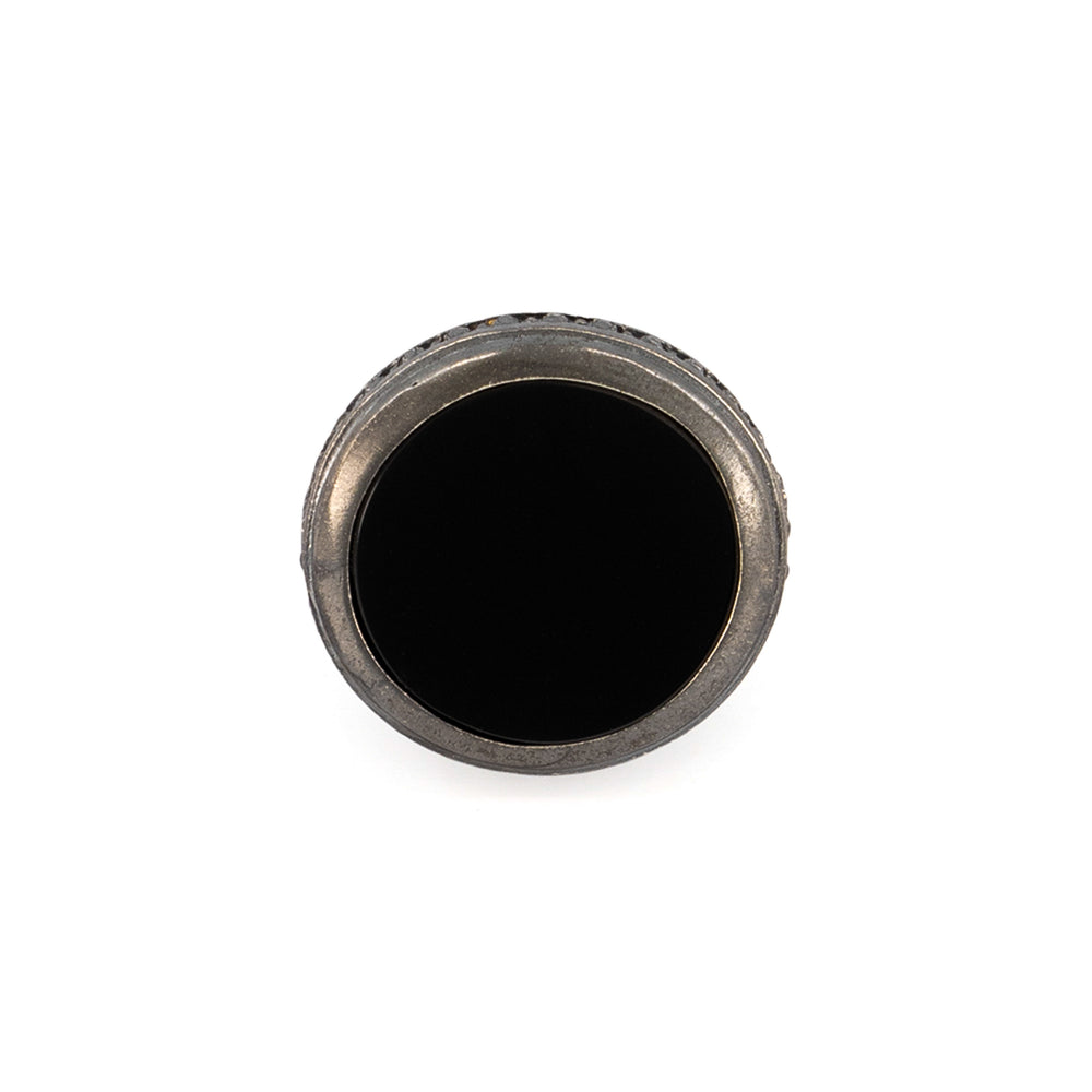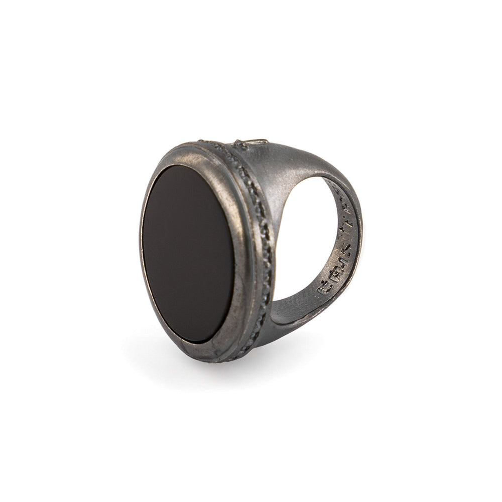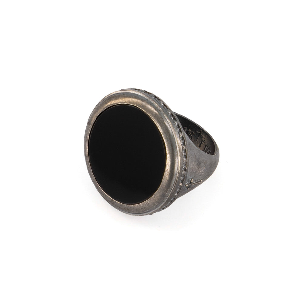 El anillo está elaborado con fina plata de ley 925 con forma redonda, con Ónix negra en la parte central . y con un acabado pavonado que le dá un aspecto vintage a la pieza.