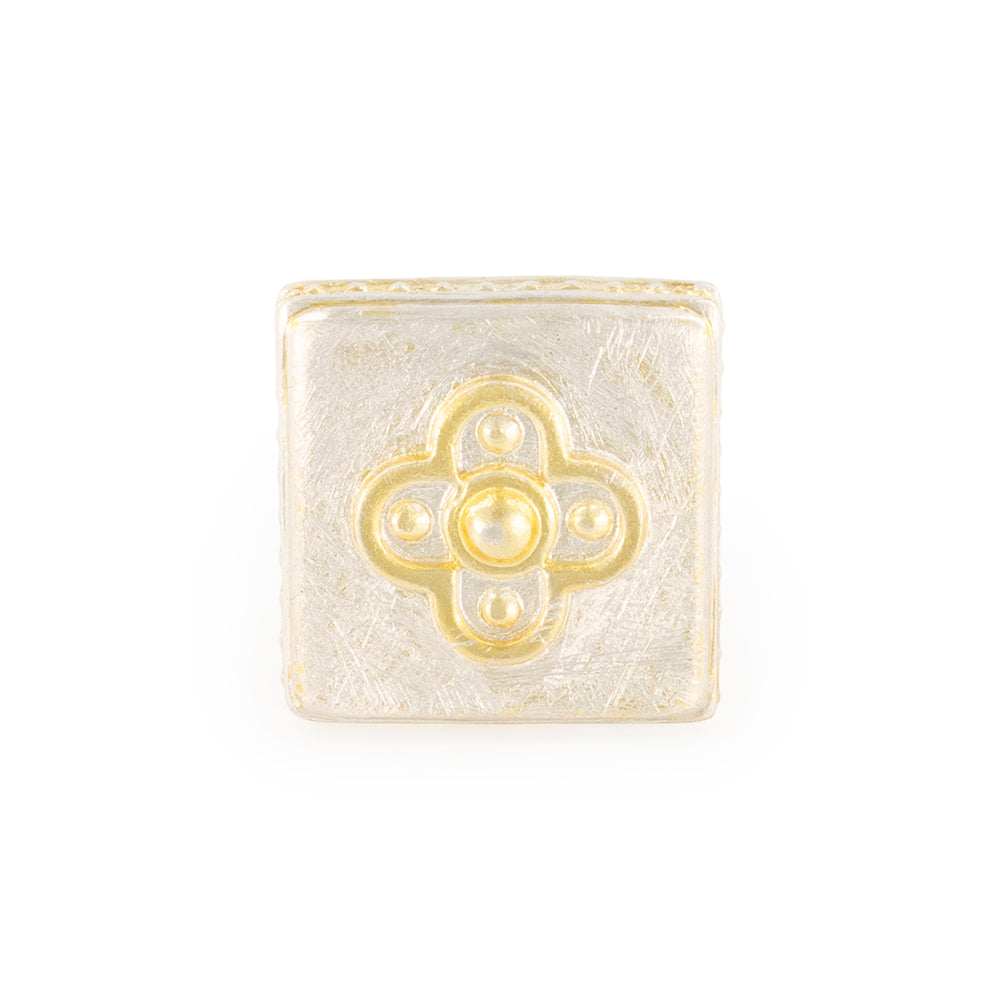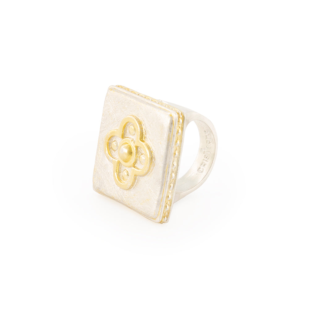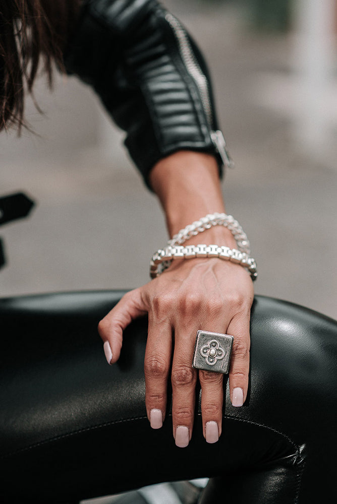 Anillo de plata .925 barrilado, Nuestro símbolo NaOlli al centro proviene del manto de la Virgen de Guadalupe, el cual engloba la concepción del universo y sus cuatro fuerzas primordiales: agua, tierra, fuego y aire. Dolores, no dejes que su nombre literal te engañe, pues esta pieza representa el carisma y la fuerza de voluntad que nada te detiene.