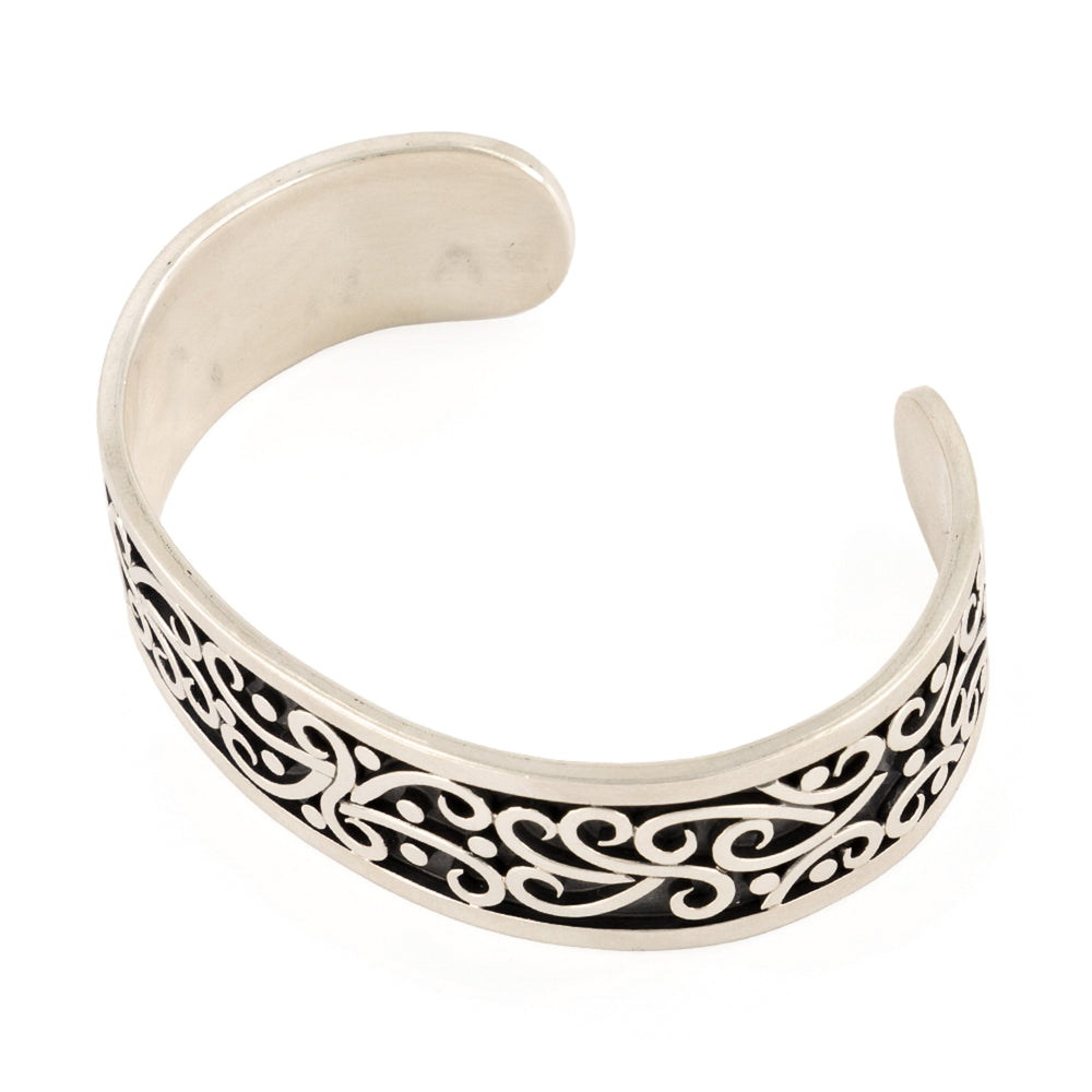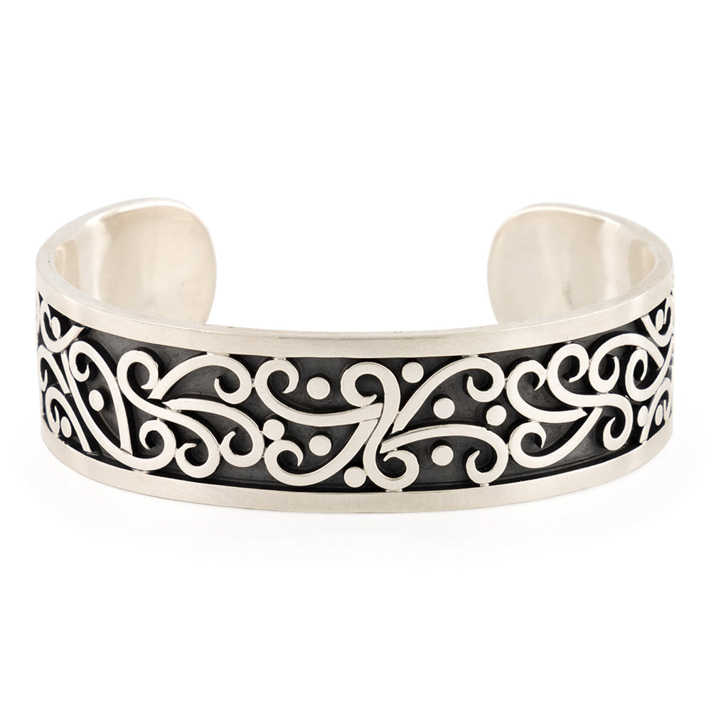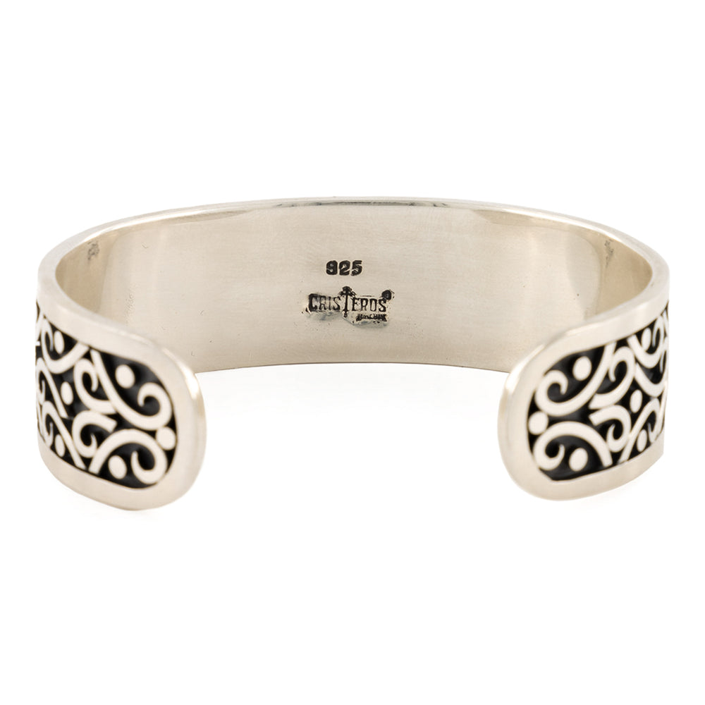 El brazalete está elaborado con fina plata de ley 925 con figuras únicas que rodean todo el brazalete en un acabao barrilado que le dá un aspecto brilloso a la pieza.