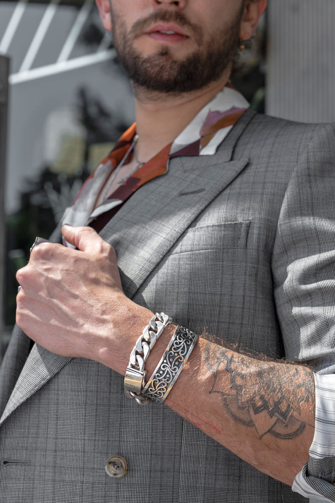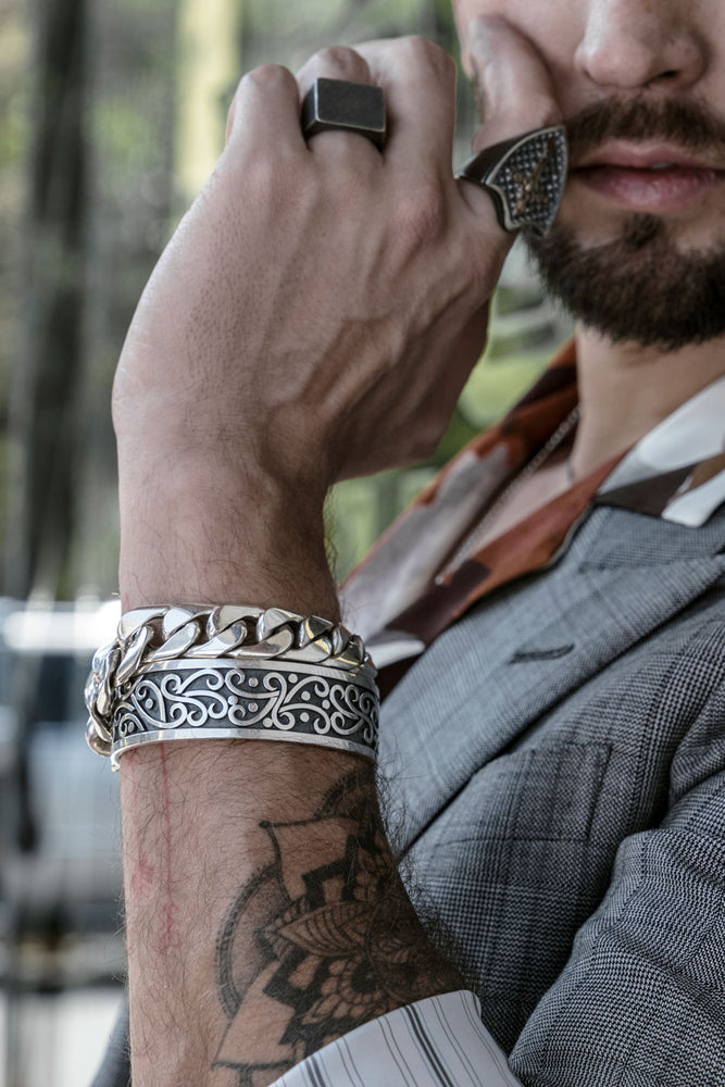 Brazalete de plata 925. La pieza Felix se distingue por ser diferente y única debido a que cada acabo es exclusivo. Esta pieza representa al idealista que le gusta encontrar su propio camino en lugar de seguir a la gente.