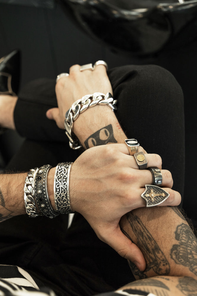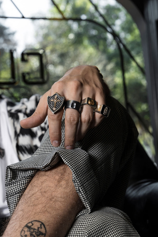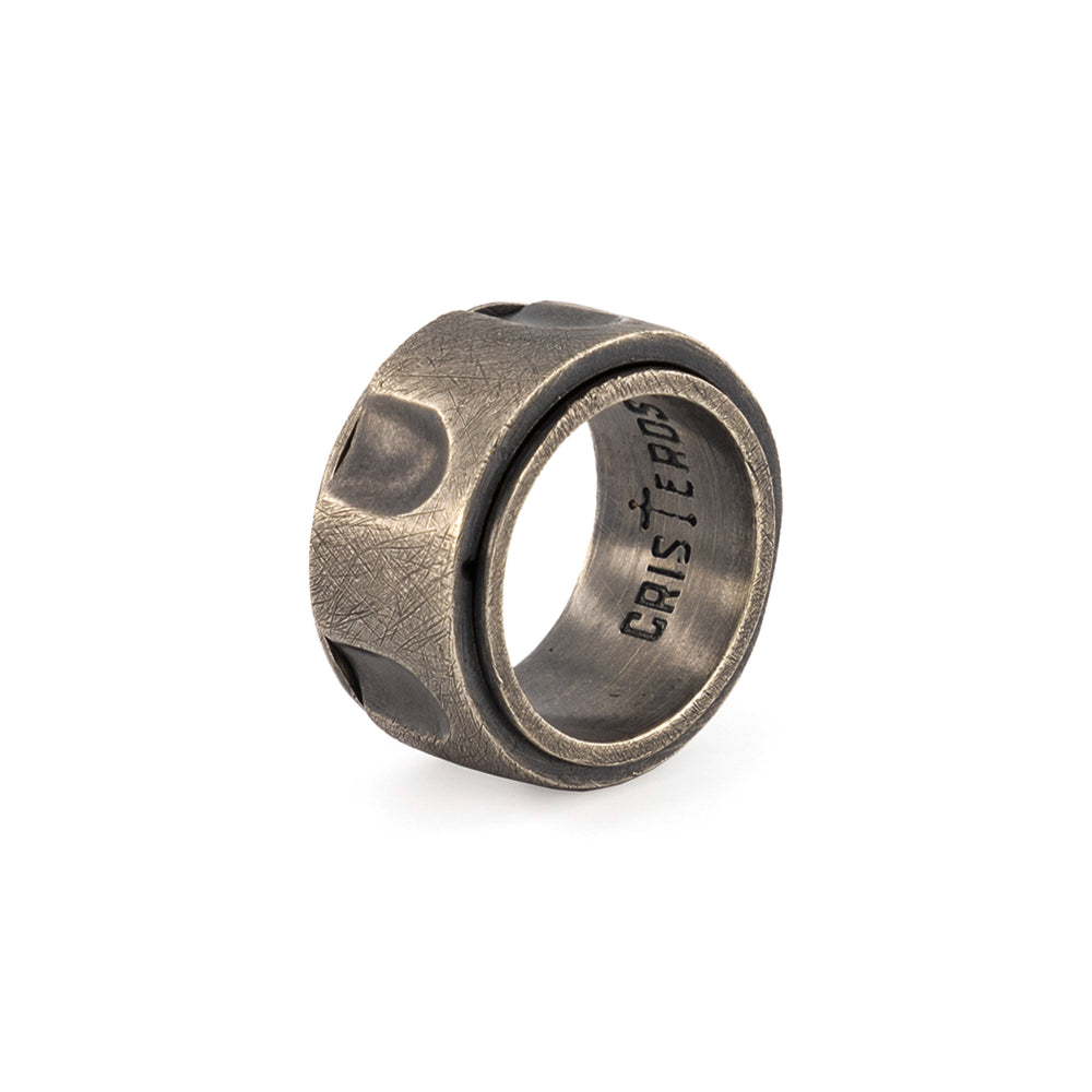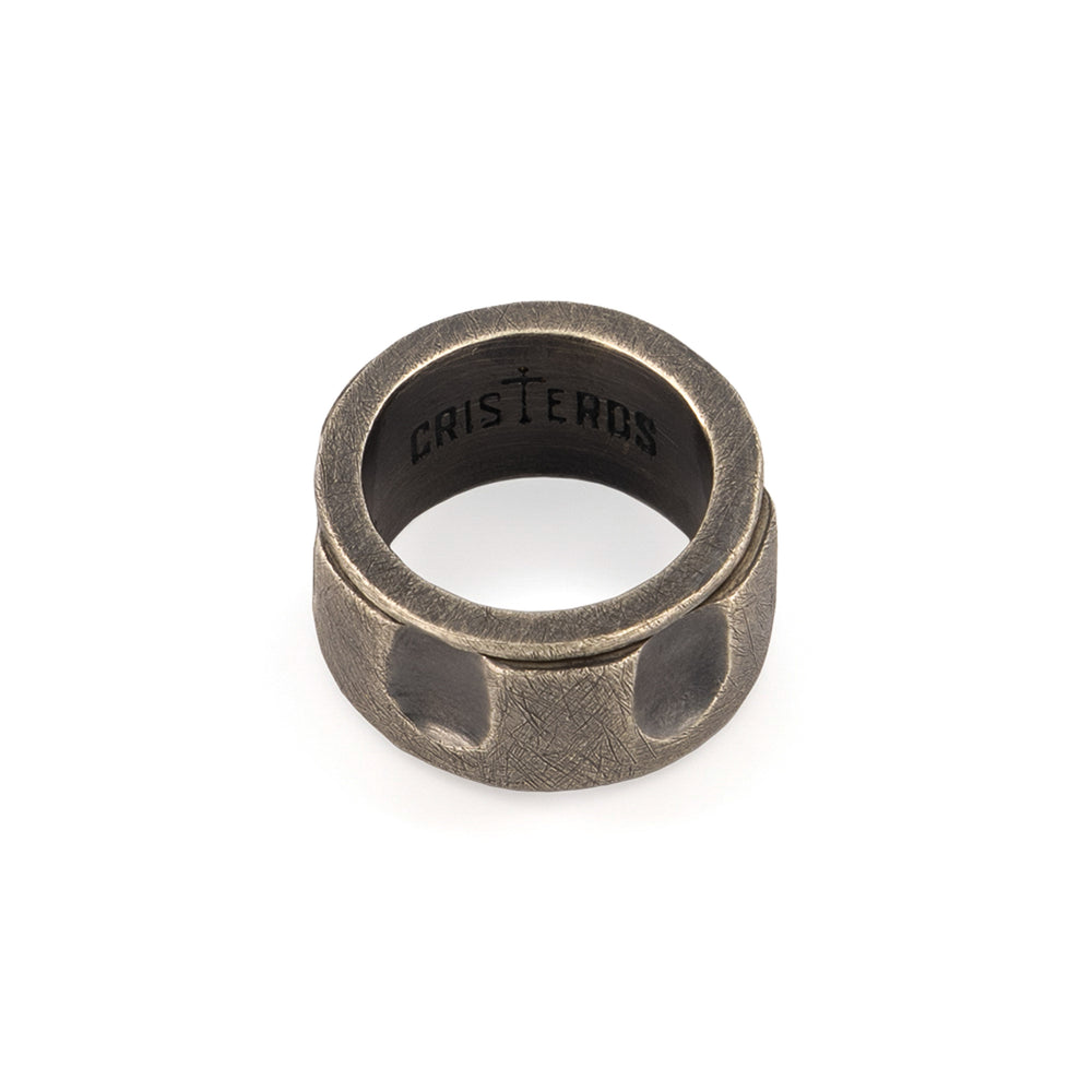 El anillo está elaborado con fina plata de ley 925, contiene el logo de la marca en la parte interior y tiene un acabado pavonado el cual le dá un aspecto vintage