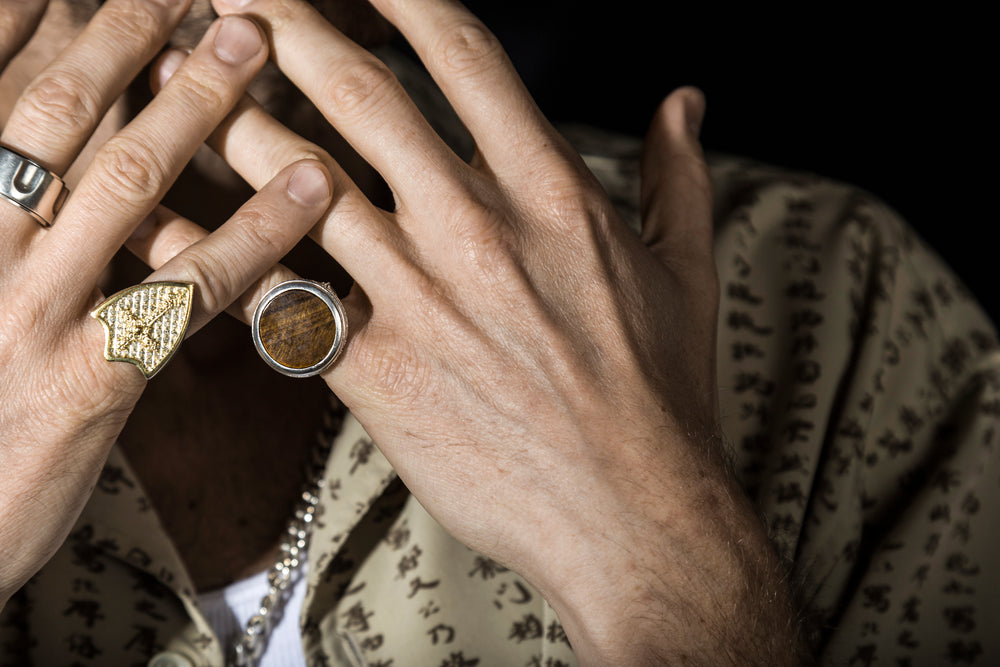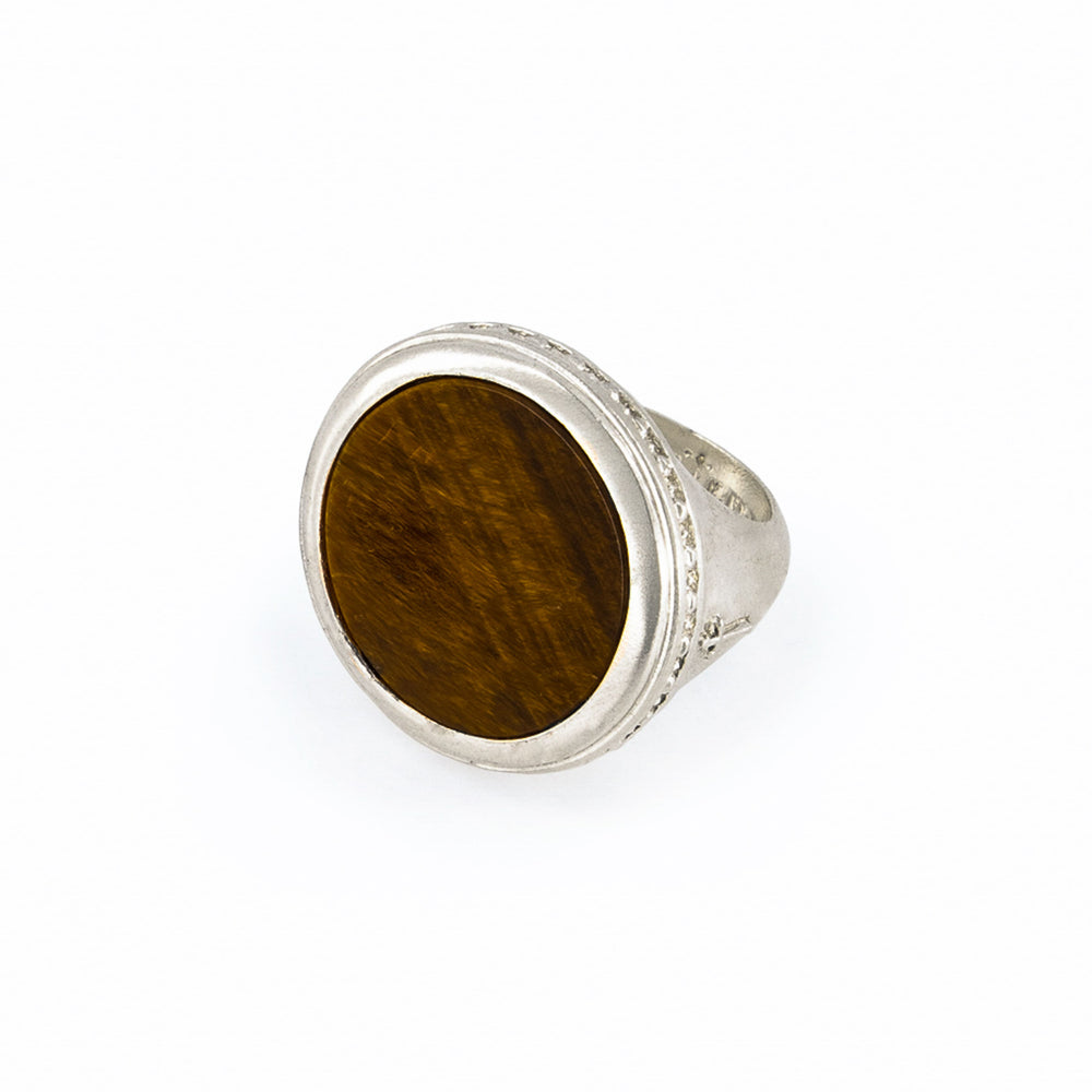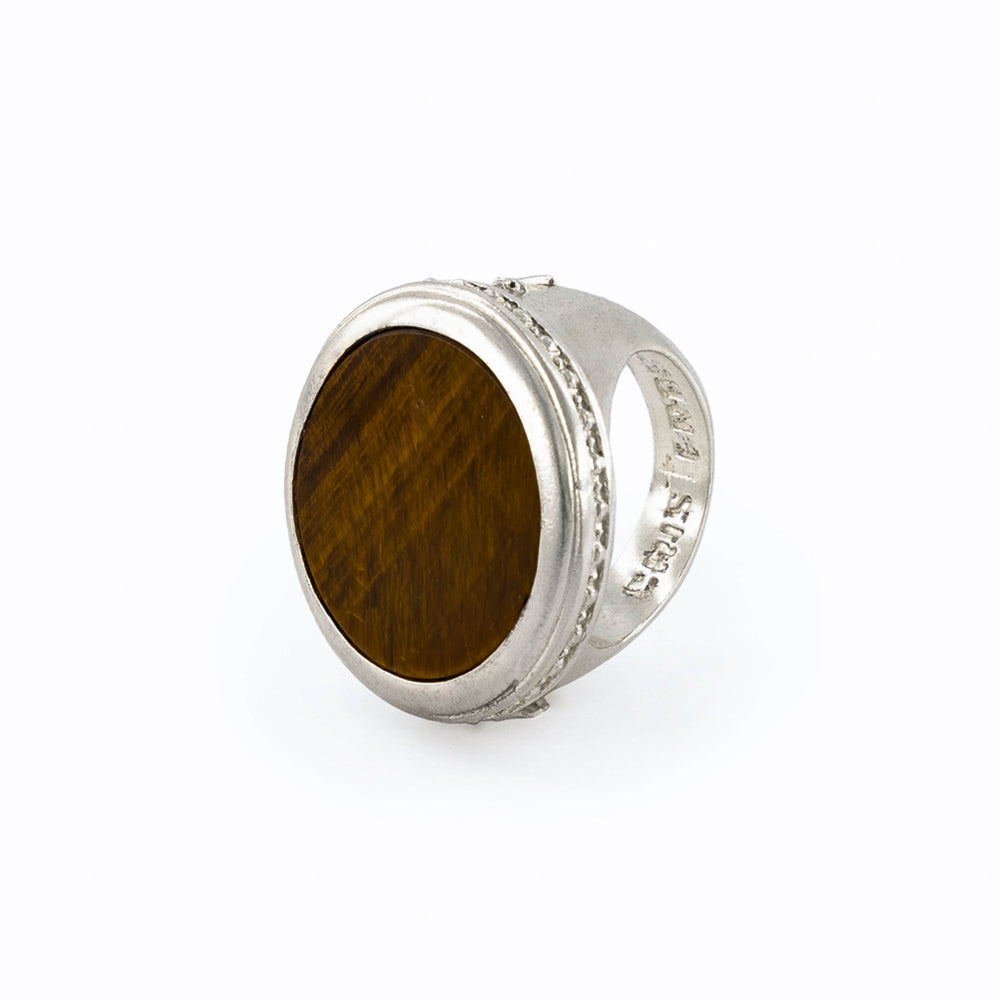 El anillo está elaborado con fina plata de ley 925 con forma redonda, con piedra ojo de tigre café en la parte central . y con un acabado barrilado que le dá un aspecto brilloso a la pieza.