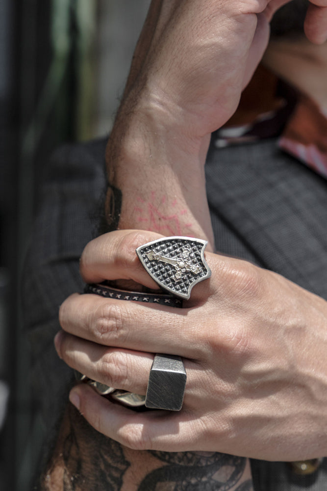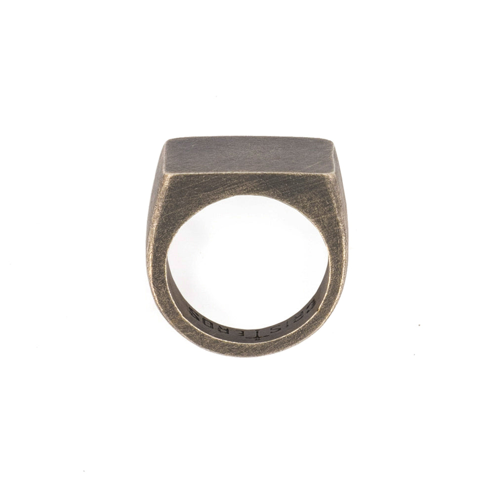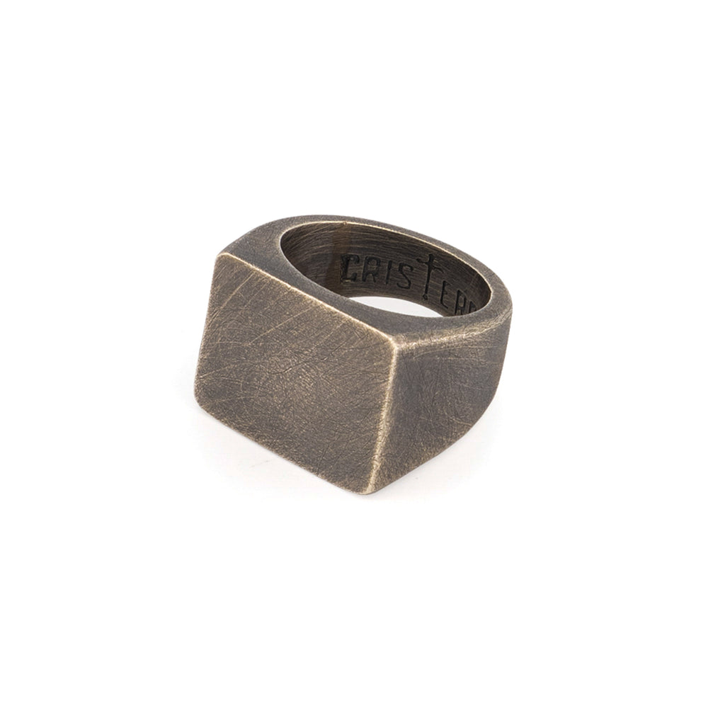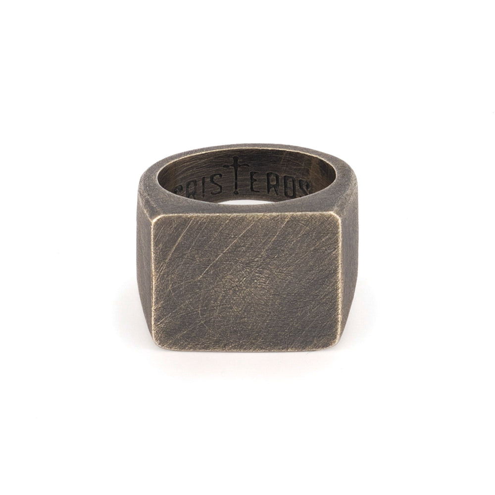 El anillo está elaborado con fina plata de ley 925 con forma cuadrada en la parte superior, liso sin ninguna figura o imagen y con un acabado pavonado que le dá un aspecto vintage.