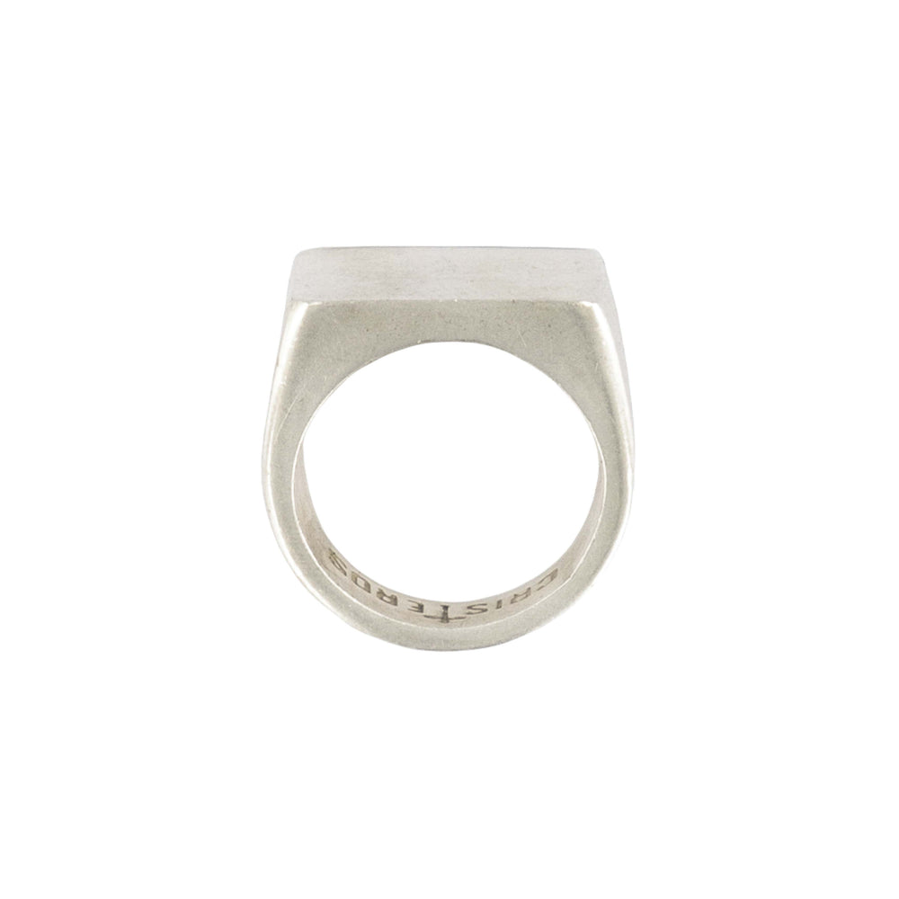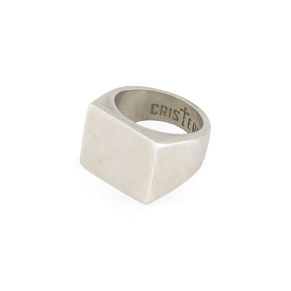 El anillo está elaborado con fina plata de ley 925 con forma cuadrada en la parte superior, liso sin ninguna figura o imagen y con un acabado barrilado que le dá un aspecto brilloso al anillo.