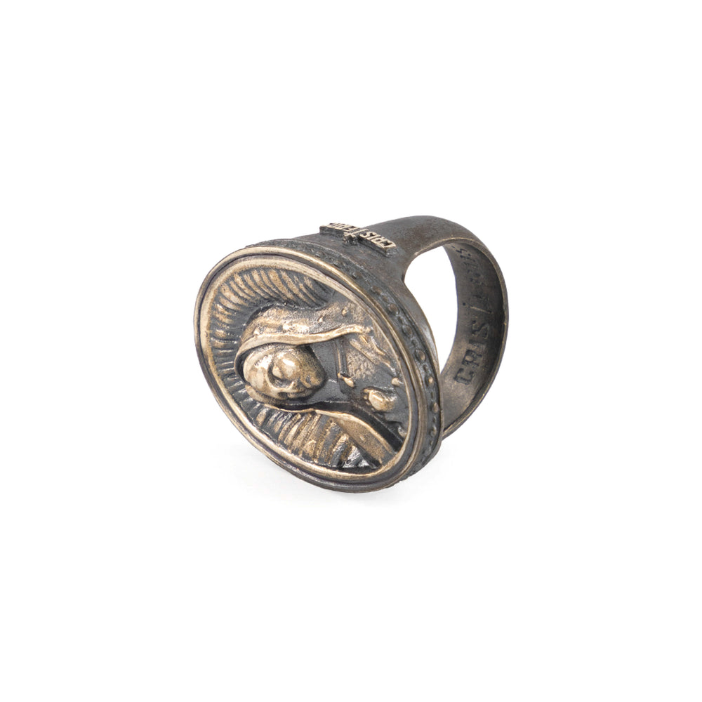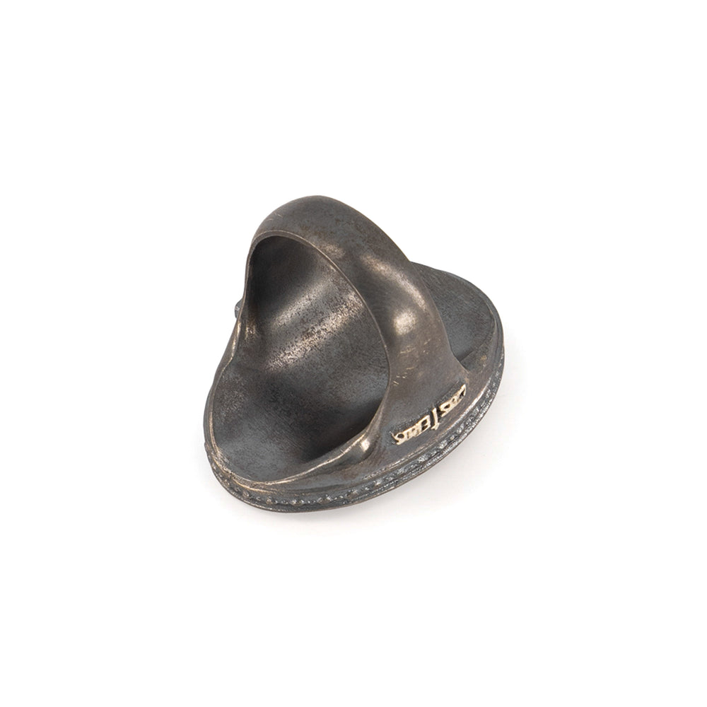 El anillo está elaborado con fina plata de ley 925 en forma de escudo con una cruz en medio y en un acabado pavonado que le da un aspecto vintage a la pieza.