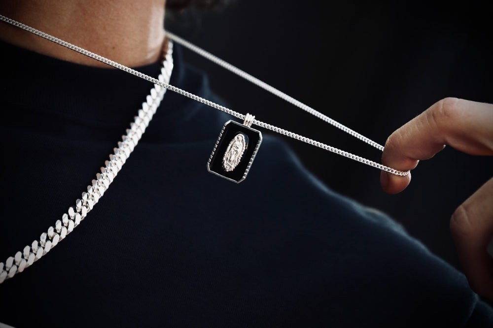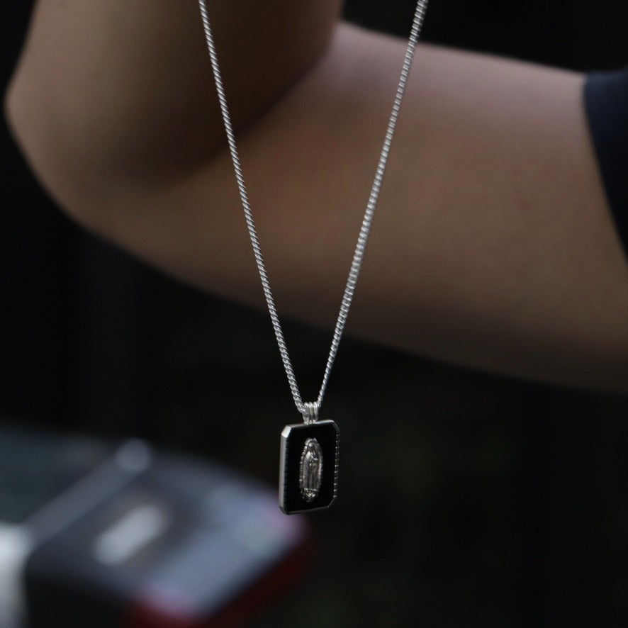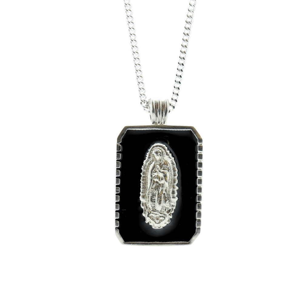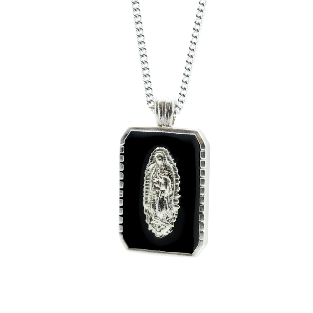 El dije está elaborado con fina plata de ley 925 con recina y en el centro la imagen de la Virgen de Guadalupe con un acabado barrilado que le da un aspecto brilloso y de lujo. Incluye cadena de plata barbara de 60cm