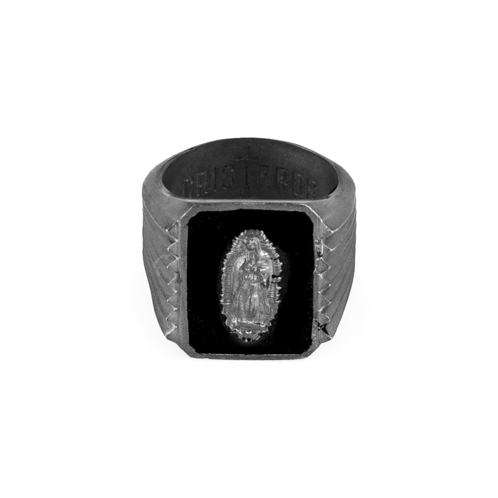 El anillo está elaborado con fina plata de ley 925 con la imagen de la Virgen de Guadalupe en el centro con un relleno de recina negra a su alrededor y con acabado pavonado para darle un aspecto vintage.
