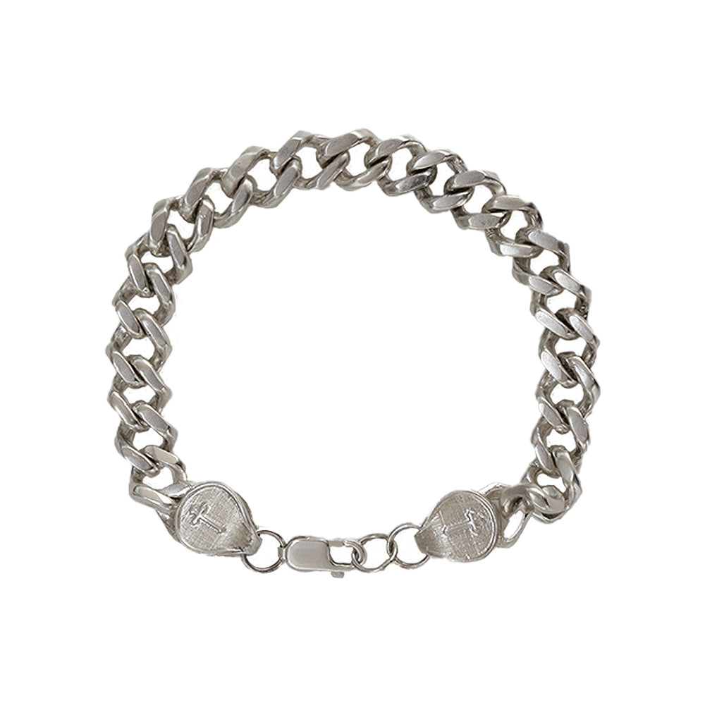 La pulsera está elaborada con fina plata de ley 925 con estilo de "esclava" y con el logo de la marca en la parte frontal del broche, con acabado barrilado que le dá un aspecto brilloso y de lujo.
