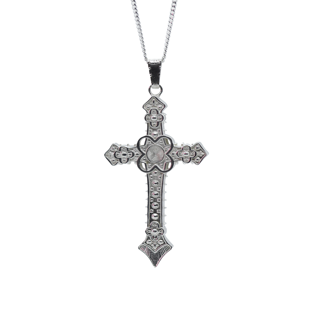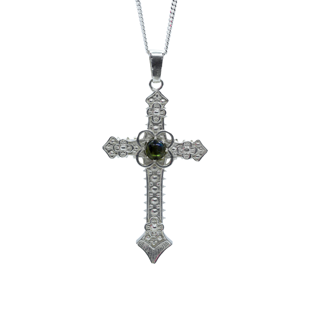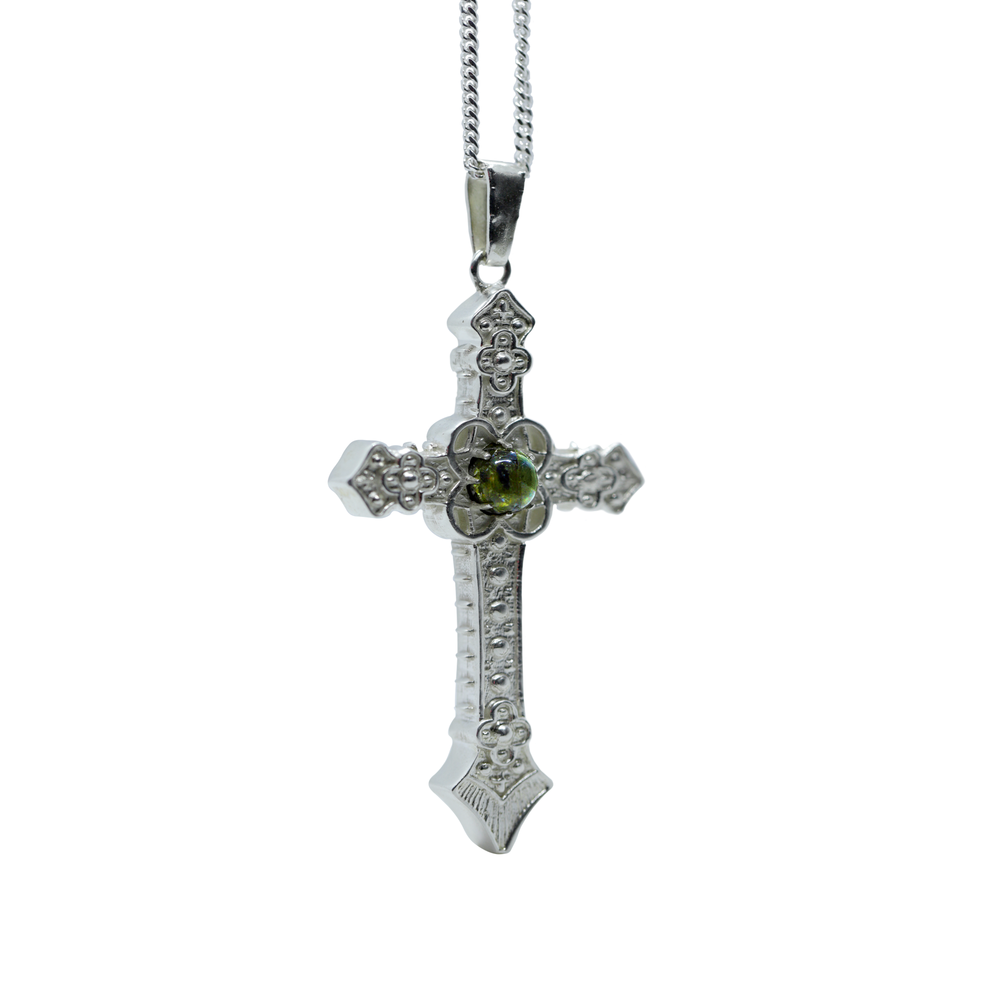 El dije está elaborado con fina plata de ley 925 en forma de cruz la cual lleva en cada una de las esquinas el símbolo NaOllin de la marca y en la parte central una piedra ópalo transparente, con un acabado pavonado que le da un aspecto vintage y clásico a toda la pieza. Incluye cadena de plata barbada de 60cm