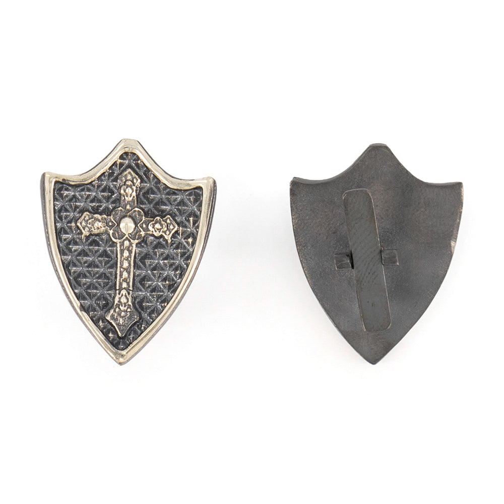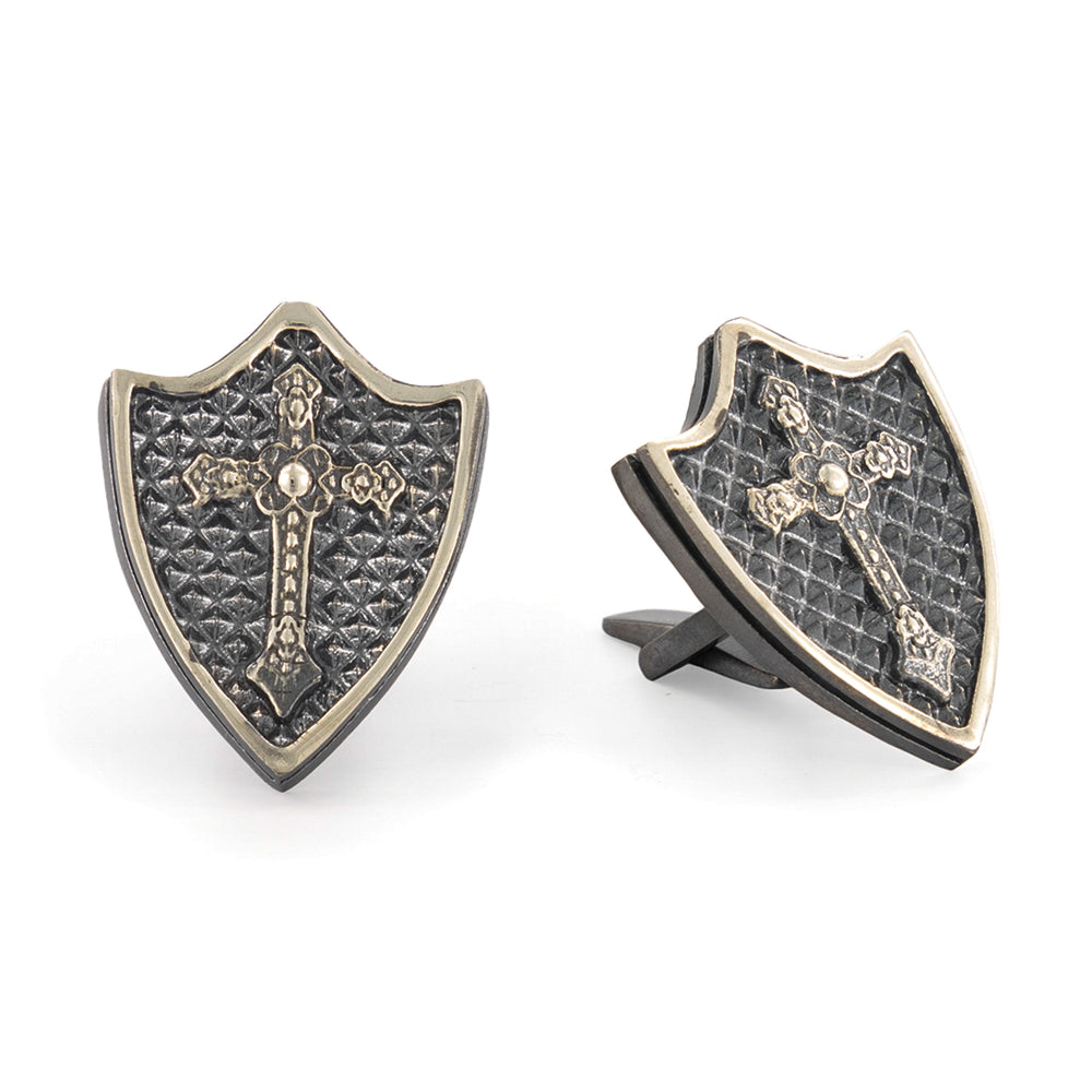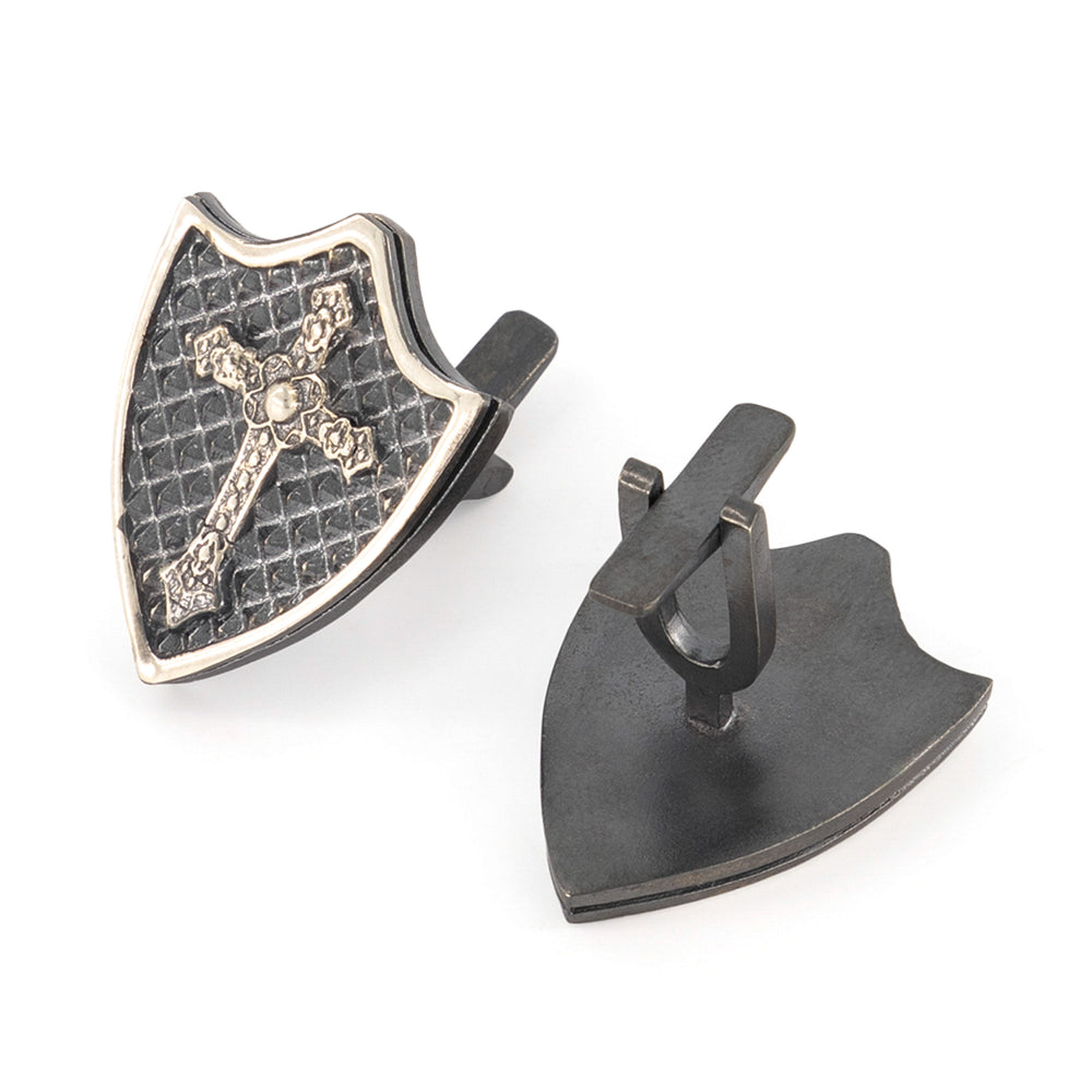 Las mancuernillas están elaboradas con fina plata de ley 925 con un diseño de escudo y al cruz cristera en la parte central de cada una y en un acabado pavonado que le da el aspecto clásico y vintage.