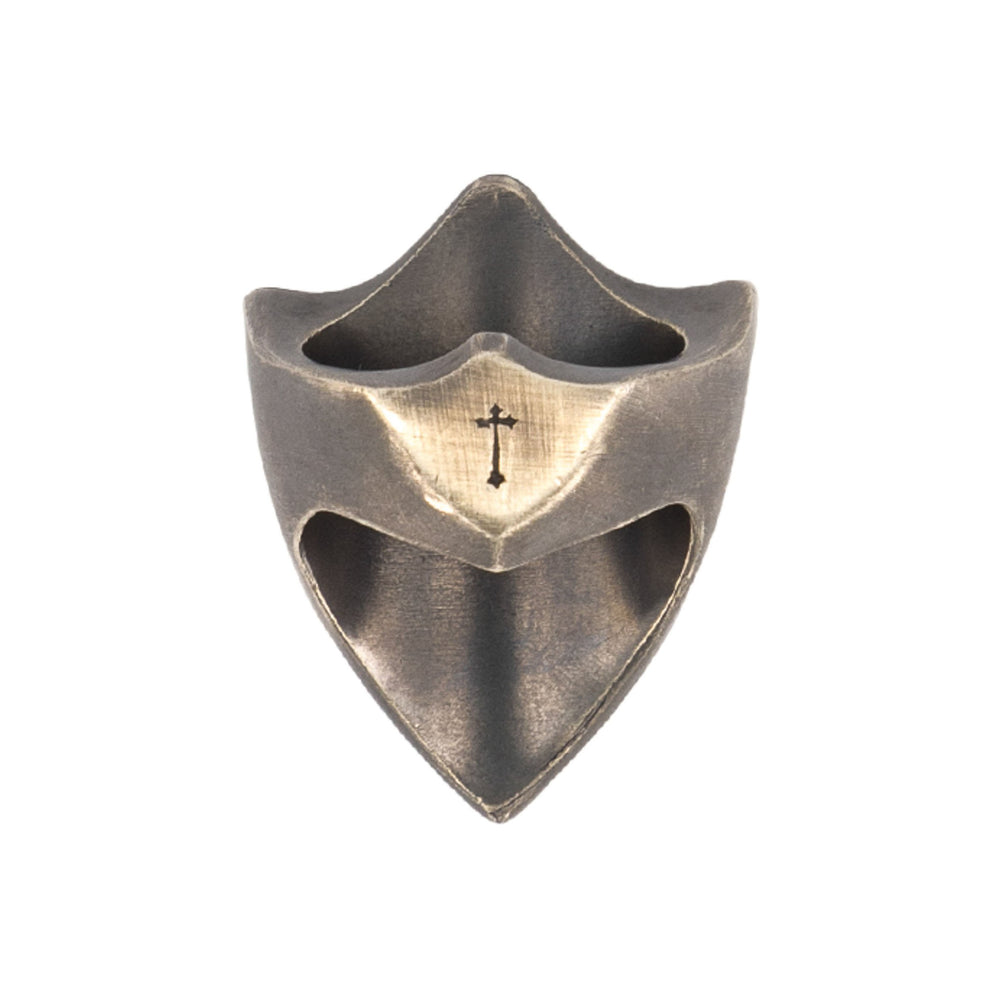 El anillo está elaborado con fina plata de ley 925 en forma de escudo con una cruz enmedio y en un acabado pavonado que le dá un aspecto vintage a la pieza.